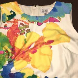 Sleeveless floral print sheath with back zip closure. Vibrant hues of greens, blues, yellows and pinks.