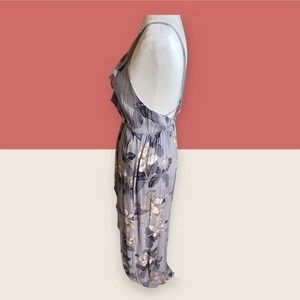 A pretty floral paisley print lends warm-weather appeal to a high/low maxi dress styled with ruffle detailing at the surplice bodice and slender crisscrossing straps in back. Slips on over head. Surplice V-neck. Sleeveless. Elasticized waist. Partially lined. 100% viscose.