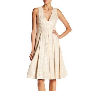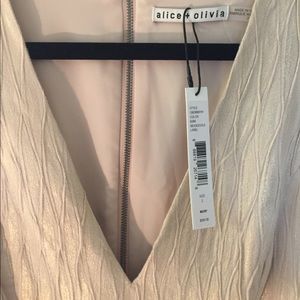 NWT gorgeous fit and flare midi Alice + Olivia dress. Size 2. Beige/gold. Perfect cocktail dress for a wedding. Both shell and lining are polyester and elastane. Hits just below my knee (5'6) and fits perfectly around my bust and waist (120 lbs) with a slight flare from the waist down. The dress is fitted up top but the flare is quite flowy and perfect for dancing the night away! MAKE AN OFFER!