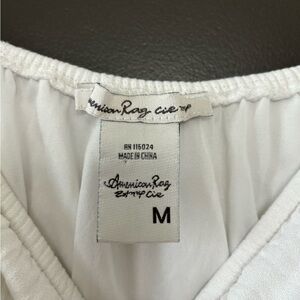 American Rag dainty bohemian mini dress size Medium. In excellent condition with no stains or holes. Off the shoulder with tassle drawstring and scrunched, fitted elastic waistline. Eyelet detailing covers a lining underneath to prevent see-through.