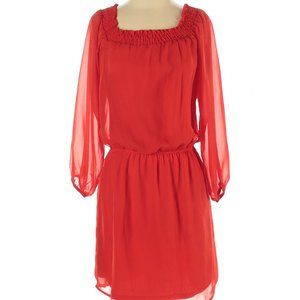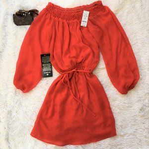 This little hottie is new with tags for $119, is a size XS, has sheer sleeves, a versatile gathered neck that can be worn off the shoulder(s), if you choose. It has a waist tie and is made of 100% polyester - super soft and comfy!