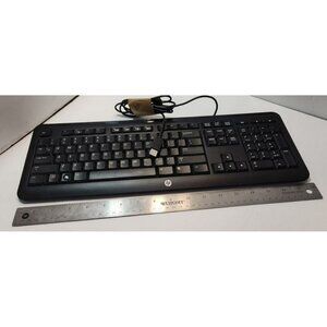 This is a standard wired desktop keyboard from HP with a QWERTY layout and English language support. It is black in color and has model numbers E145614, T3A002, and N279. Pre-owned. In good condition. Please see pictures for details.