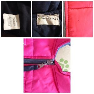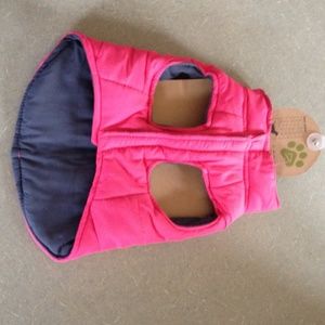 Pink doggie coat. Worn maybe 5 times. There r two holes at top, as shown in pic, from where the coat was attached to the cardboard. Also another small hole near bottom. Smoke free home. Fits 11-13" back
