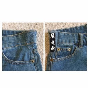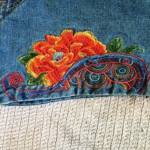 So this beauty was bought from the woman who embroidered them, but unfortunately will not fit me for the life of me. No other pair like them. They have never been worn. And are gorgeous! They have little added side jean panels you can see in the photo. The tag says a size 28, but definitely smaller. I would say they would fit a 24-26. Measurements: waist 14.5" laying flat, leg holes are 10" laying flat.