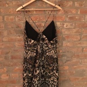 Perfect cocktail dress - brocade pattern with black and gold, silky poly fabric, mini dress with v neck and straps. Hidden side zip. Lined. π