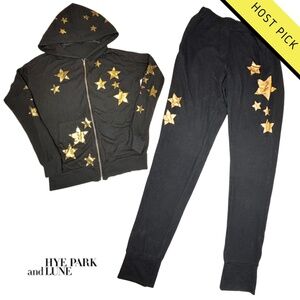 *Used* black & gold Hye Park and Lune hoodie & pants set in a size 1 (S). Features metallic golden stars. Hoodie has zipper closure & 2 front pockets. Jogger pants have elastic waistband & 2 side pockets.