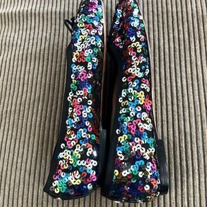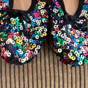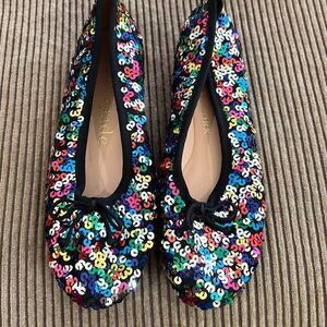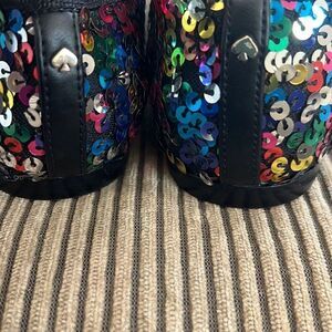 Kate Spade Honey Flat, multi-color sequin, with black trim and front tie. Super classy, fun and all season.