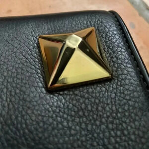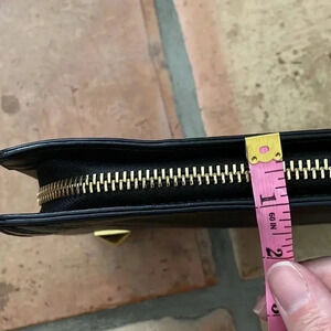 Excellent pre-owned condition. Very minor wear on gold studs. Six interior card slots and large slots on each side inside. Cute animal print fabric interior. Genuine leather.
