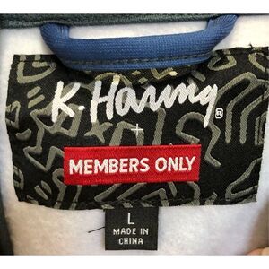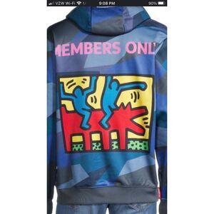 Members Only + Keith Harang collaboration on this  colorful graphic hoodie with artwork by Jean Michel Basquiat. This one is in men's size LARGE. It has an attached drawstring (lined) hood with logo, long sleeves, ribbed cuffs and hem, dropped shoulders and kangaroo pocket. It's 100% polyester, so machine wash (in cold) and tumble dry (on low). Graphic Basquiat artwork on front and back. "K Harang" logo on both sleeves. Red Members Only logo patch on left chest and on right cuffed hem. Members Only logo boldly printed on back. The pit-to-pit measurement is 25" (without stretching, the length is 29" and the sleeves are 27" (including 3" ribbed cuff). Jean Michel Basquiat and Keith Harang were artist collaborators in the early 80s vibrant New York art scene. This is so colorful and cool. If you want it, grab it before I decide to keep it! And it's NWT!