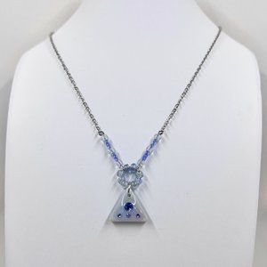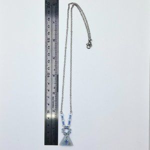 New / Hand crafted - Iridescent Jeweled Pyramid AB Beaded “Y” Style Necklace. Silver Tone flat chain necklace is 20” long, and the pyramid is made from resin and is .75” wide by .75” tall. Resin has iridescent color shifting blue/purple mica, and the pyramid has light blue Swarovski accent jewels. Necklace is new and is in excellent condition.