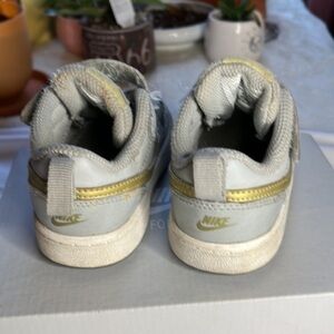Nike Court Borough Low 2 in Light Smoke greyetallic Gold Star. Designed with style and comfort in mind, these shoes are perfect for your little one. The size 6C ensures a secure fit for their growing feet. Please note that there are minor flaws in the shoe, as shown in the last photo. However, these flaws are hardly noticeable unless pressure is applied to the front of the shoe, please see last photo!) Step up your child's footwear game with these used hand me downs that were my sons and now that he has grown out of them I’m trying to give them a second life Nike Court Borough Low 2’s.