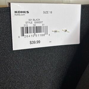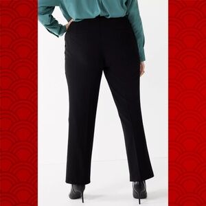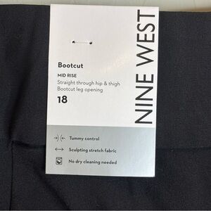 *New* black Nine West mid rise bootcut pants in a plus size 18. Features bootcut leg opening, pleated legs, zip front with hook/bar & button closure, 2 faux side pockets, 2 faux back pockets & belt loops. Other details: tummy control, sculpting stretch fabric & no dry cleaning needed.