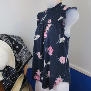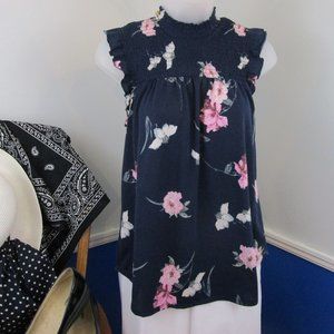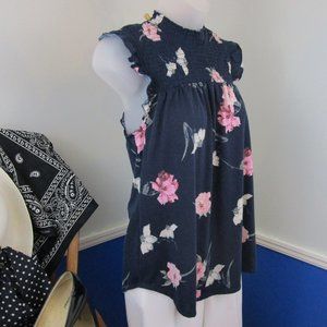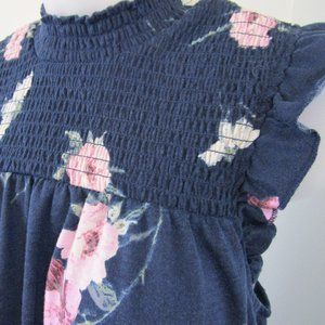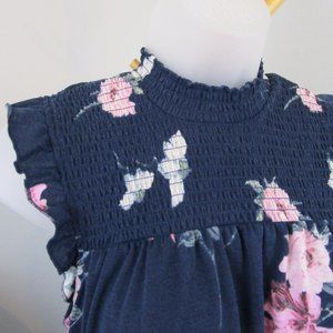 Cute navy, pink, white and green floral pattern on a soft knit poly blend fabric. Very flattering fit, with feminine flutter cap sleeves. Worn once, in excellent condition with no flaws. All tags removed. Stretch chest smocking measures 6.5" from shoulder to chest.