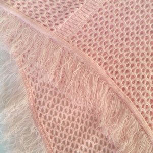 This is a brand new, soft and plush, pale light pink, loose knit crochet, shoulder wrap shawl with an angled neckline and threaded fringe running the bottom edge. It is a one size fits all, square shaped shawl with an angular drape and measures 23" at its shortest lengths and 30" at its longest points.