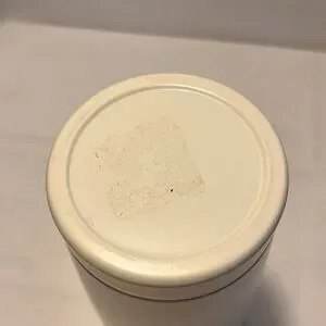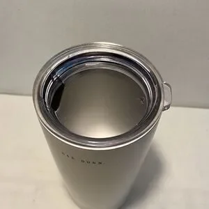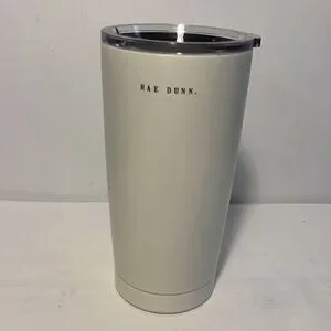 Cream colored Rae Dunn travel mug. Clear lid