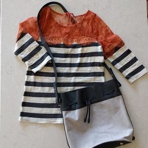 Large interior compartment divided by zipper pouch. Zipper pouch is attached all the way to the bottom. Strap is approximately 40 inches, outside bag dimensions are 13x13 inches and bottom is 7x11. NWOT