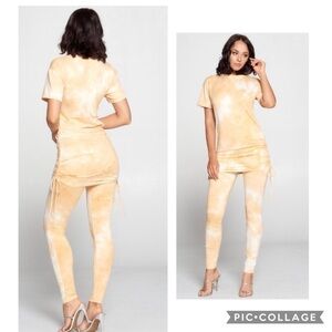 Cute!!! Two Piece Butterscotch Top & Pants. Top has drawstring sides & short sleeves & pants are legging like but much softer. True to size! 96% Poly & 4% Spandex.
