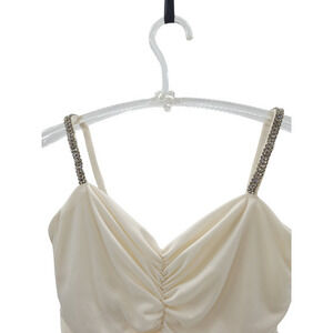Vintage Nicole Ivory Gather Ruched Rhinestone Spaghetti Strap Long Retro Glam Body Con Dress