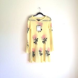 Adorable sweater dress by Wildfox Couture featuring a pale buttercup yellow, floral pattern with super long sleeves finished with a bell shaped hem.
