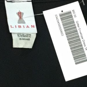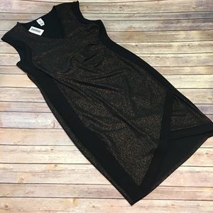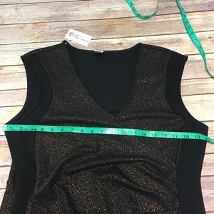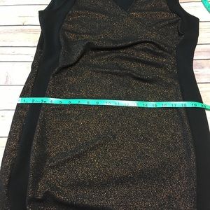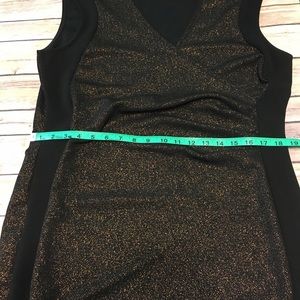 Black and gold glittery sleeveless dress with an asymmetrical hem and surplice/faux wrap top. Approximate measurements shown but dress has stretch. New with tags!