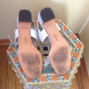 Beautiful white leather Ferragamo sandals wit signature symbol on front! ❤️ Elastic on the back strap and adjustable front strap! ❤️ These sandals are used but in great condition! ❤️ Please note that they have a little scratch on inside part of front strap on left shoe and very small one on the back of heel on right shoe! ❤️ Sandals have the most comfortable heels that are 2" high! ❤️ Perfect for summer!💐👙☀️🎉🎊