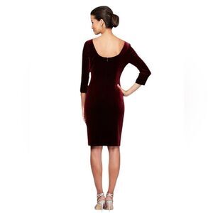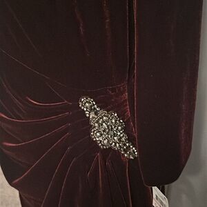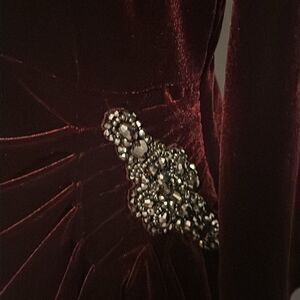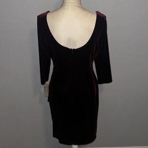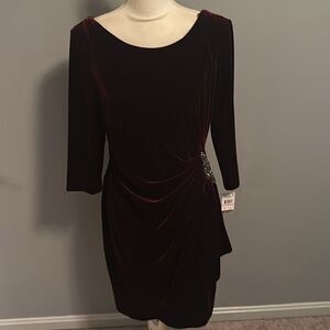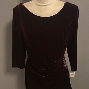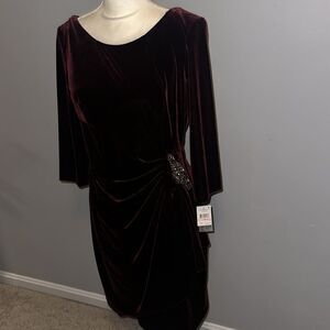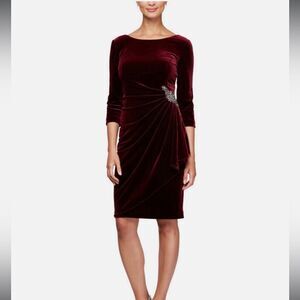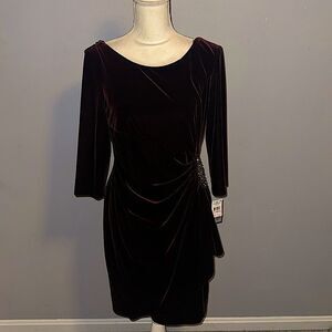 ALEX EVENINGS Stretch Velvet Ruched Petite Dress with Beaded Hip in the color wine!