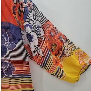 Infuse your wardrobe with vibrant charm with this blouse. Featuring a sheer fabric adorned with floral stripes in yellow, red, and blue, this blouse offers a unique blend of color and pattern. The long balloon sleeves and Henley neckline add a bohemian touch, while the tie front detail enhances its playful style. This blouse is ideal for those who love expressive and eclectic vintage fashion.
