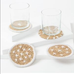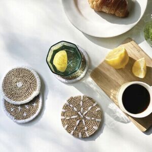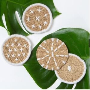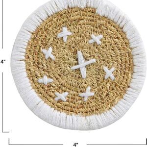 These coasters are a great solution for keeping your surfaces clean. Made out of hand-woven seagrass and accented with white hand-stitched cotton thread, these cute yet practical coasters are perfect for putting under beverages or filled jar candles. They come in a set of 4.