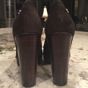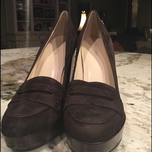 "Work Week Chic Host Pick" ~Klein literally gave us a space for a shiny copper!!! So precious, sleek and versatile, these loafers have a 1-inch platform, making the 4-1/2 inch heel most comfortable... Triple-stitched with silk cording and tagged outside with presh signature rhodium tags on the outside rear of each shoe. style is "Lorrie." Interior is cushioned--a lovely cream color. Platform and bull-nosed heels are stacked wood in appearance-gorgeous.LOWEST πππ