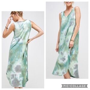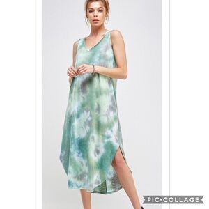 Cute! Beautiful Colors...Shades of Green... Tie Dyed T-Shirt Dress. Dress is a midi w/Wide T-Straps. Has splits on both side. Loose fit. True to size. 60% cotton 40% poly