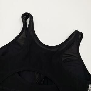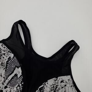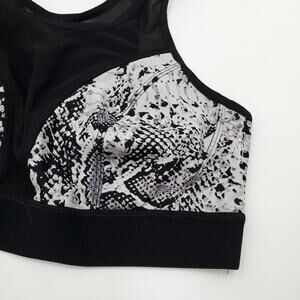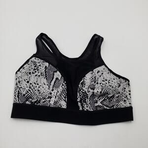 Gently used, missing one removable pad. Size large. Black and gray print. Size large. Four-way stretch 208gm. 2 super soft fabric for total comfort. Removable cups for shape and support. Mesh panels around the body for extra cooling. Structured design to allow full range of movement. High support