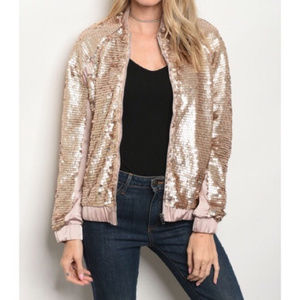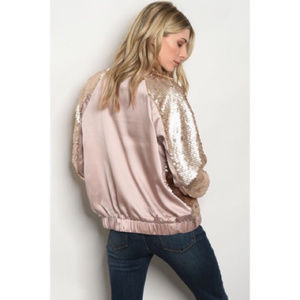 Stunning gold bomber jacket adorned with sequins in the front and a satin-like finish in the back!