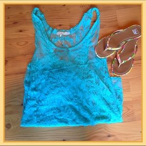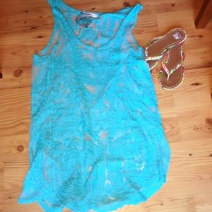 Brand new with tags! - this cutie can be used as both a tunic bathing suit cover up because its sheer. Color is Aqua/Turquoise in sheer lace.