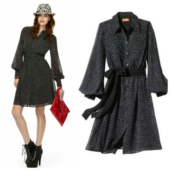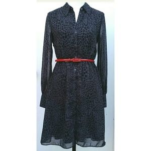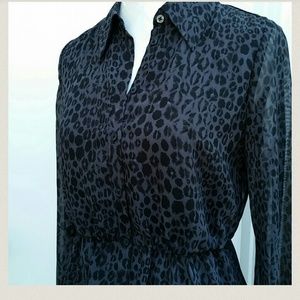 A classic print on a button down shirt dress with long, semi-sheer sleeves that have a 3 button cuffed closure. Collar neck. Elastic waistband. A - line shape. Fully lined.