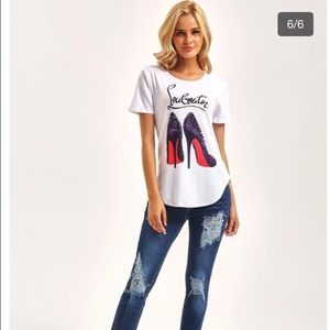 HOST PICKšORDERING MOREā¼ļøNWT Louboutin Shoe Short-Sleeved Tee. *Runs small* Cotton/Polyester, Round Neckline. Smoke/Pet Free Household. *Not Louboutin brand* Bust (Inch):S:33 M:35 L:37 XL:39 XXL:41 Length (Inch): S:25 M:26 L:26 XL:27 XXL:28. ***Also comes in lightweight long sleeve. Let me know what size ASAP. Sold out immediately numerous times