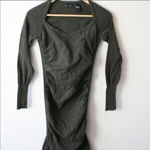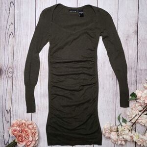 Olive green, lightweight sweater dress with side ruching and wide sweetheart neckline. Very fitted!