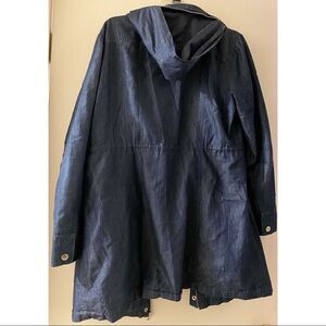 A modern twist on denim, this jacket has a zip front, zip neckline hood and drawstring waist for a stylish take on chilly days. Polyester. Washable. Imported.