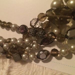 @alecia1212 :: okay, platinum and grey-ish white luminescent pearls of varying sizes; I see, marquisite pave balls, purples, smoky Quartz, faceted pewter oblongs, roughed out metallic golds and green stone raw cubes, small (literally, roughed out, unique); smoky greens and smoky Browns; also brandy-colored crystals, round & faceted; and larger copper and silver reflective faceted balls; each bead and Pearl is double knotted between and a toggle clasp, allowing 4 different lengths in dark gunmetal-- every metal is COVERED. βΊοΈ