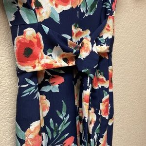 Navy coral green floral cropped romper with v-neckline sash tie at waist. Front at v-neckline to hem 46-47 inches, side sash 26 at longest angle each side. Bust arm seam to arm seam 18-19 inches flat & slightly stretch. Back neckline to hem is 58 inches, and waist band seam to seam 24 inches, back neckline to mid-rise 29 inches, inseam at mid-rise to hem 22-23 inches, dry clean. Invisible zipper 20 5/8 inches.
