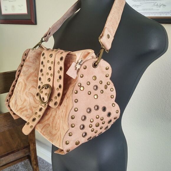 Gorgeous design with metal cutouts. suede material. Strap does not adjust and a small imperfection on the bottom (last picture)