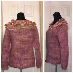 Vintage Wool Ribbon Fringe Embellished Sweater Sz M. By Sherry De Leon. Purple, Pink & Beige Color Wool on Bodice. Green, Pink & Orange Ribbon Embellishment Around Neckline. Crewneck. Long Sleeve. Materials: 100% Wool Mohair. Measurements: Chest Circumference - 38 inches/ Waist Circumference - 39 inches/ Sleeve Circumference - 11 inches/ Sleeve Length - 22 inches/ Sweater Length - 25 inches