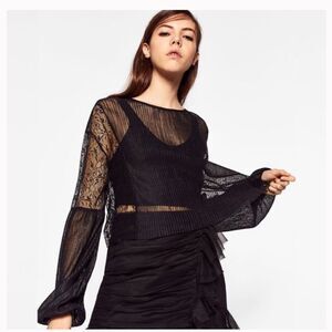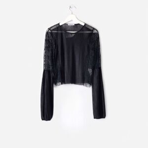 Cropped long sleeve top. Lace panels. Sheer fabric. Round neckline. Long puffy sleeve. Elastic cuffs. Contrast finish. Raw hem.