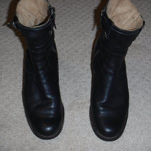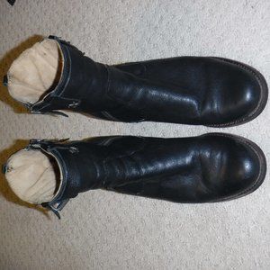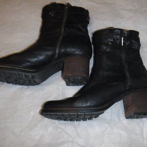 Leather upper, lining and Leather-wrapped memory-foam foot bed. Size 9M, 6 1/2" shaft 2 1/2" stacked-leather heel. Lug rubber sole and heel cap. Trask buffalo logo on zipper tab. Leather wrapping on heels shows wear.