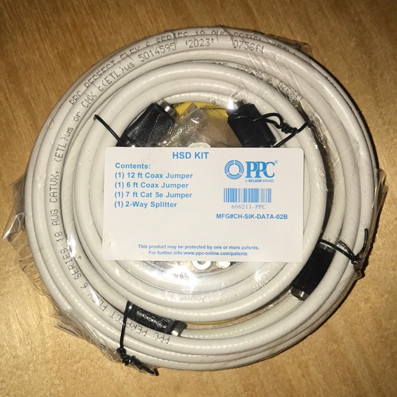 Contents: 12 foot coax jumper 6 foot coax jumper 7 foot cat 5e jumper Two-way splitter