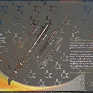 This Curling Iron Have Interchangeable tourmaline ceramic curling wands to create stunning curls of any size or shape. Of the hundreds of hair Curlers available on the market, only a handful offer solid Tourmaline Ceramic Barrel. Nearly all use metal plates coated in a thin layer of ceramic. 100% solid ceramic is the only material that provides the highest hair protection from frying and burning your hair. The KOR Ceramic Irons is 100% true, solid ceramic. It's plates will never peel or chip or expose your hair to damages like irons with metal plates , ceramic plated or ceramic coated irons. KOR irons features the best possible heat distribution and retention. Solid ceramic plates also have 100 times more negative ions than ceramic-coated plates. Why is that important for the health of your hair? Damaged hair is positively charged - from static electricity, chemicals in styling products or use of metal-heated hair tools. The positive charge keeps hair follicles open, dried out and brittle. Negative ions neutralize the positive charge, closing hair follicles and smoothing the hair shaft. They actively condition the hair and shine it, while eliminating frizz and static. The result is hair that is shinier, more nourished and h