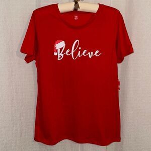 HT L Red White Logo “Believe” Santa Christmas Hat over B Short Sleeve Tee