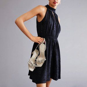 Classic timeless size S black HTF By Anthropologie Halter Neck Mini Dress in a fun animal print. NWT.