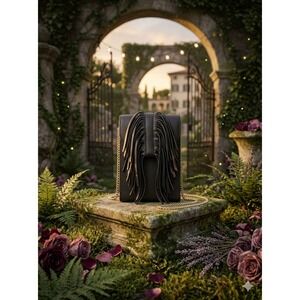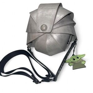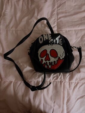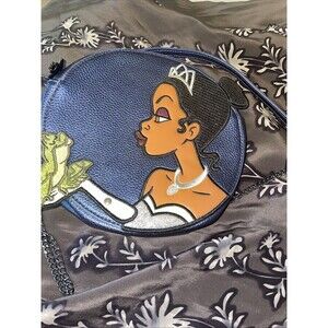 This Little Mermaid themed bag is in excellent pre-owned condition. There are two small flaws though. I notice an indentation on the back of the bag, and there is a red mark on the lining inside (see pics of both). Ursula has holographic hair, and her signature sinister smile. The fringe is attached to the bottom as the zipper pull has a charm on it that says “Ariel”. The inside is line and has some pockets. The strap is adjustable. Approximate measurements are 10”x10”x3”.