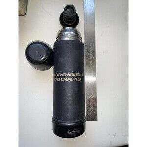 This vintage Aladdin C-17 McDonnell Douglas Commemorative Thermos W Mug is a must-have for any collector. The three-piece set includes a stainless steel thermos container with a push button lid and a 1 quart capacity, perfect for keeping your hot or cold beverages at the desired temperature for up to 8 hours. The black color and solid pattern make it a stylish addition to any kitchen.