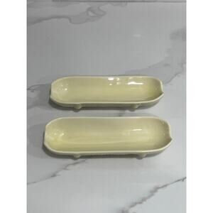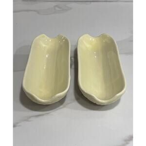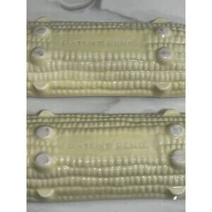 This hard-to-find vintage ceramic corn cob dish holder set is a unique and collectible addition to any kitchen or table setting. Designed to hold corn on the cob neatly, these dishes feature a charming vintage style with a patent pending mark, adding to their authenticity and appeal.